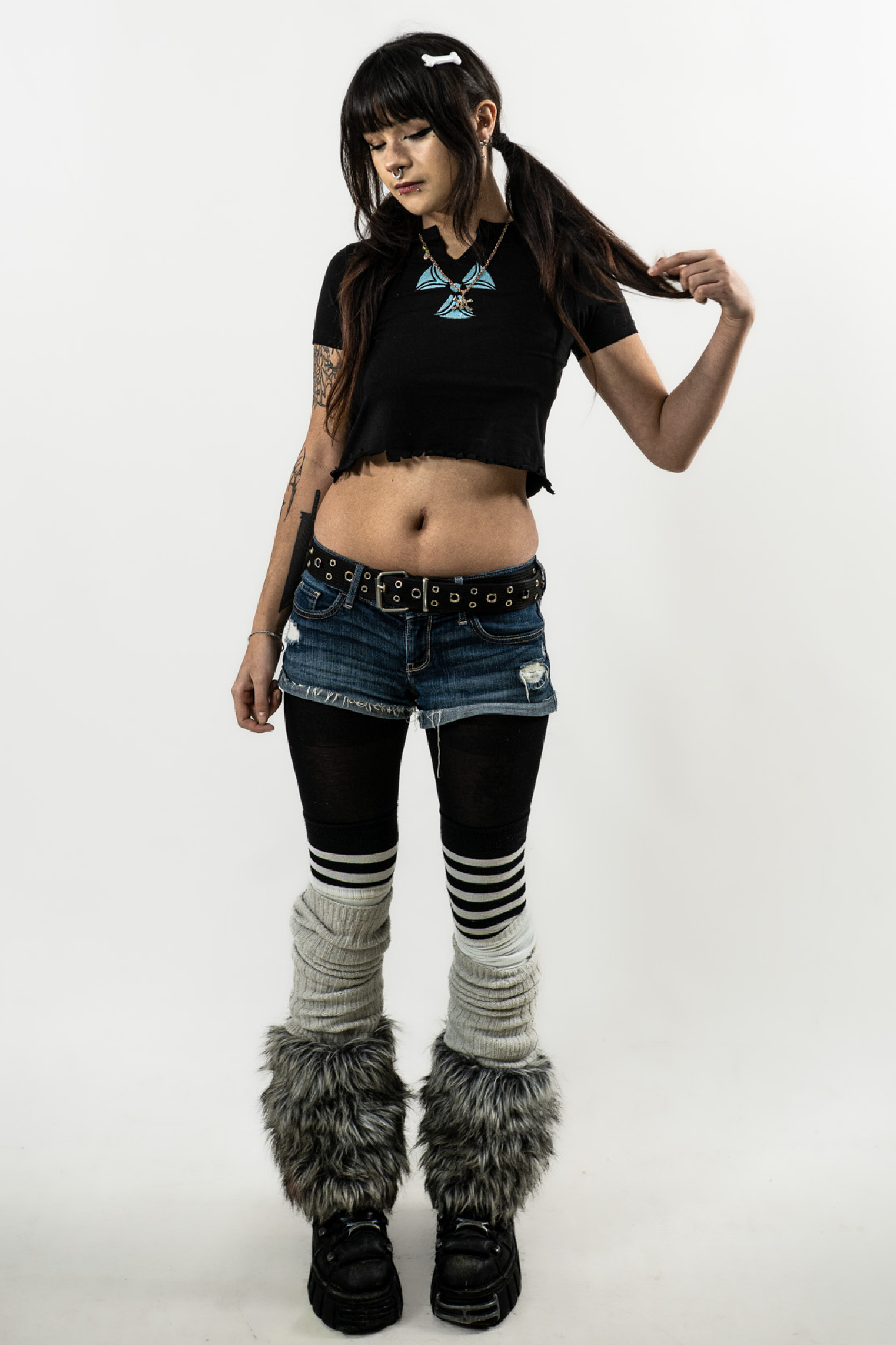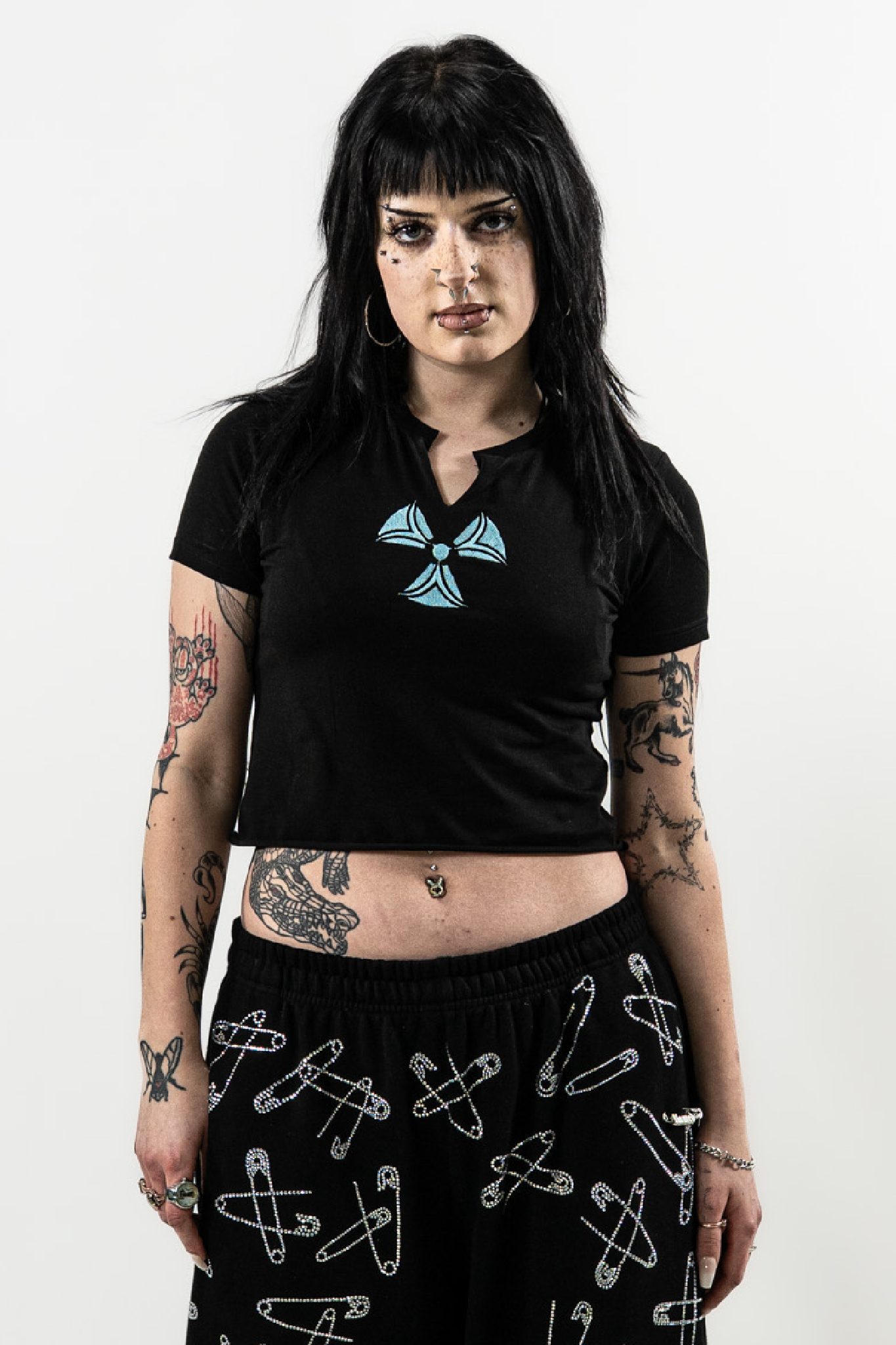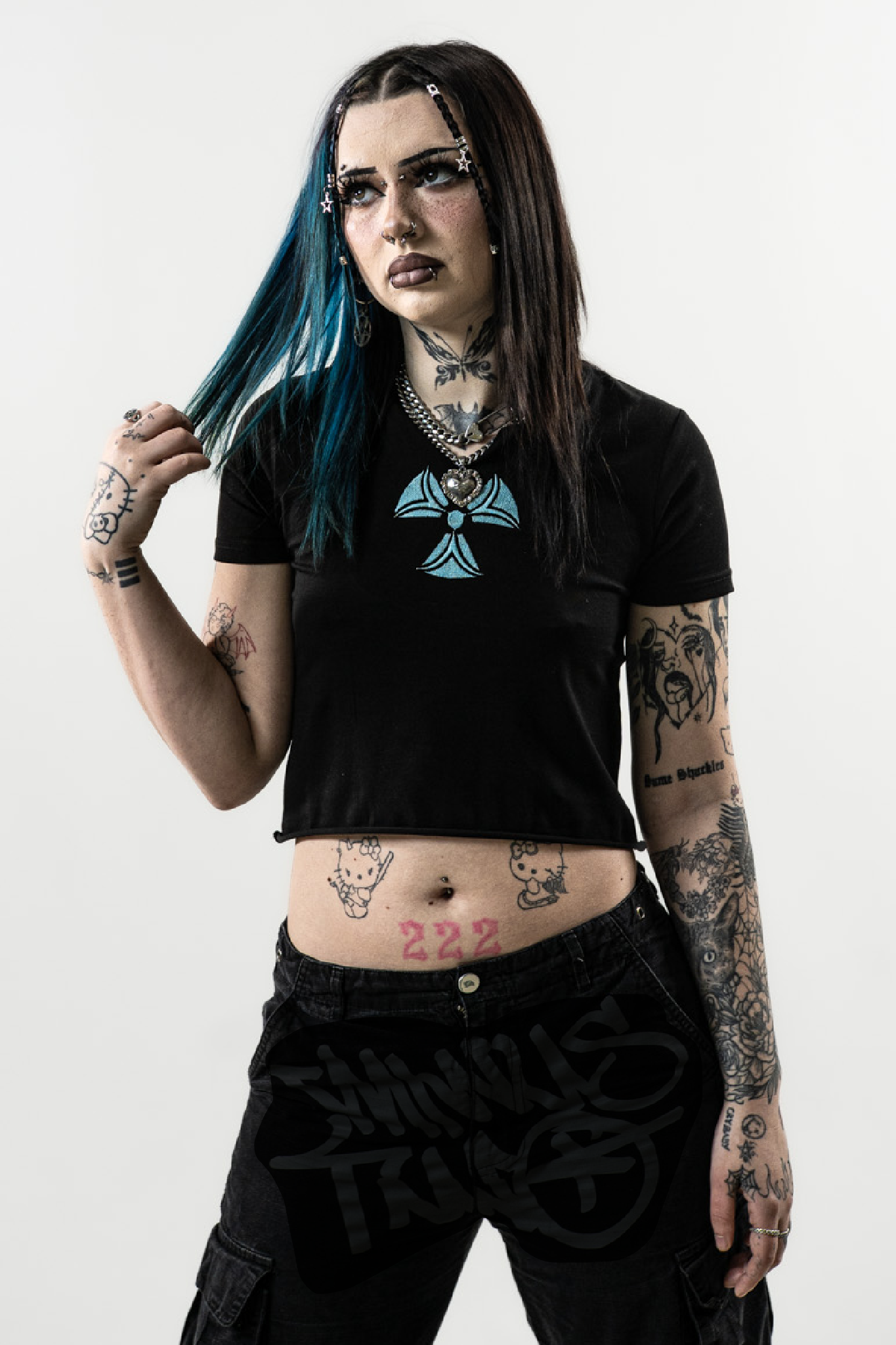 This Baby T is embroidered with our signature glow in the dark thread, allowing for a frosted blue glow in dark environments. Applied to the garment within our faclity